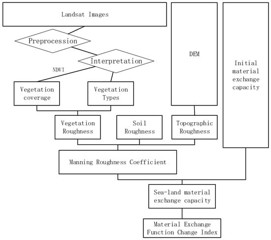 Coastal intertidal wetland is the most active ecosystem and is located in the transition zone between ocean and continent []. It is an important channel and a place for material circulation and energy exchange between the ocean and the surrounding environment [,]. The material exchange function of intertidal wetland maintains the ecosystem structure, process, and functional foundations and has a profound impact on the succession and degradation of the intertidal ecosystem. For this reason, understanding and scientifically assessing the temporal and spatial changes in the material exchange function of the intertidal zone ecosystem has important practical significance. At present, studies on the material exchange function of intertidal wetland ecosystems in coastal areas are in the relatively early stage. In 1974, Odum pioneered an experiment concerning the importance of the nutrient inputs of tidal water in the intertidal zone for maintaining the high productivity of S. alterniflora []. On this basis, it was proposed that the intertidal wetland was based on dissolved organic matter. The conclusion that carbon, and particulate organic carbon especially, exports organic carbon to nearshore waters has become the basic theory used in a great deal of future research and management decisions [,,]. In recent years, with the urgent need for coastal ecological protection and management, European and American researchers have successively carried out research on wetland evaluation methods, with intertidal wetland deposition as the main function; they obtained a large number of research results [,,,]. For example, there is research that uses coastal wetland hydrogeomorphological indicators to establish the material deposition model of intertidal wetland and uses the evaluation model of the nutrient and organic carbon exchange function to evaluate the material exchange function of the intertidal zone. Research on the material exchange function of intertidal wetlands started relatively late, and a series of qualitative and quantitative studies have been carried out on the mechanism of the nutrient and organic matter migration of wetlands, on the calculation of exchange flux, and on seasonal dynamic changes [,,,]; however, research rarely involves the evaluation of the material exchange function of the intertidal zone. Although some scholars assessed the material exchange capacity of wetlands by constructing a typical intertidal material exchange function index in the Bohai Bay [], they lacked a spatial perspective to reveal changes in the material exchange function of the intertidal zone.