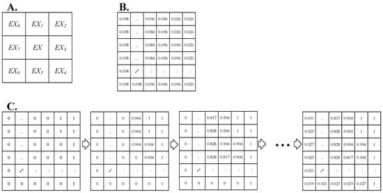 Image calculation process of land–sea exchange capacity. (A) Topological relationship and numbering of the surrounding pixels. (B) Raster map of Manning’s roughness coefficient. (C) Schematic diagram of the calculation process of sea–land exchange capacity.