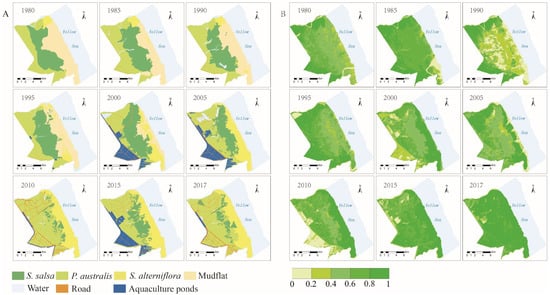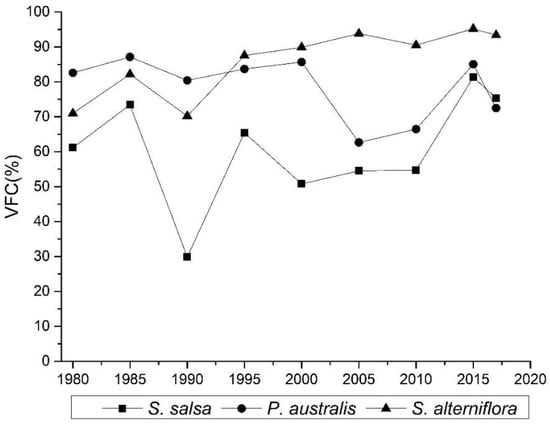 The vegetation coverage in the study area presented spatial heterogeneity (Figure 5). Before 2000, the vegetation coverage increased with the distance from the sea. After 2000, S. alterniflora was distributed in the intertidal zone, and its coverage spanned the largest area. The coverage levels of different types of vegetation were not the same. The vegetation coverage of S. alterniflora was the highest, with a value of 85.96%, followed by the vegetation coverage of P. australis, which had an average coverage of 78.46%; the vegetation coverage of S. salsa was the lowest at 60.73%. The vegetation coverage of S. alterniflora increased from 70.99% in 1980 to 93.37% in 2017(Figure 6). The vegetation coverage of P. australis stabilized at about 78%, although its vegetation coverage in 2005 and 2010 was low at around 60% for both years. The vegetation coverage of S. salsa saw a large degree of change. In 1990, its vegetation coverage was 29.81%.