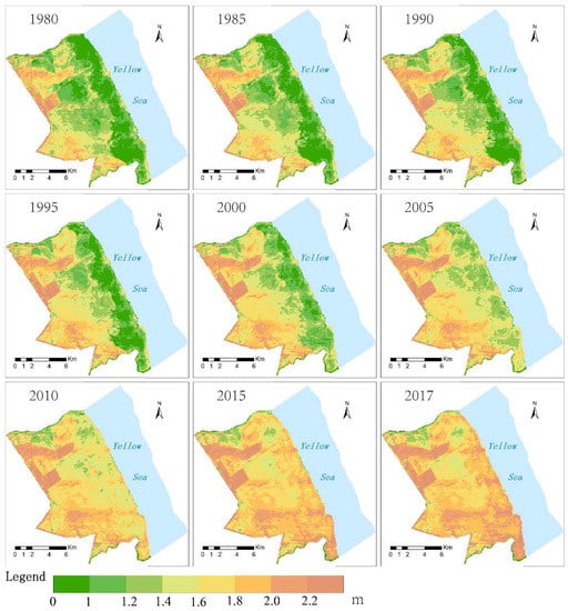 The regional elevation distribution from 1980 to 2017 is shown in Figure 7. After testing, the simulation accuracy was 0.912. It can be seen from the figure that the regional intertidal wetland faces the Yellow Sea in the east, with an average elevation between −0.84 m and 3.04 m, high in the west and low in the east. In terms of spatial changes, the topographic elevation of the S. alterniflora distribution area changed greatly from 1980 to 2017. The elevation of the S. salsa distribution area increased from 1.42 m in 1980 to 1.72 m in 2017. The P. australis beach rose from 1.71 m to 1.85 m, and the terrain height increased by 0.14 m in 37 years. In the distribution area of S. alterniflora, the average elevation of the tidal flat in 1980 was less than 1 m, and it was 1.97 m in 2017; in addition, the average elevation increased by 1.24 m. Between 2000 and 2005, the topography of the S. alterniflora distribution area rose the fastest, with an increase of 0.34 m in 5 years (Table 3).