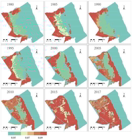 The material exchange function index and the surface Manning coefficient were closely related, and the material exchange function map from 1980 to 2017 was obtained using the model (Figure 10). The material exchange function between land and sea changed significantly in 37 years. From a spatial point of view, the distribution is high in the east and low in the west, that is, the closer it is to the sea, the stronger the material exchange function between the sea and the land. In terms of the time series, the material exchange capacity in 1980 was 0.85, and in 2017 it was 0.65, which was a decrease of 25%. With time going by, the material exchange capacity changed dynamically, showing an overall downward trend. Specifically, the size of the area with a high material exchange capacity (greater than 0.7) decreased. In 1980, the area with a high material exchange capacity was 39.67 km2. In 2017, it was less than 11.34 km2; in contrast, the area with a low material exchange capacity (less than 0.4) increased. In 1980, the area with a low material exchange capacity was 17.54 km2. By 2017, it was 71.62 km2 (Table 4).