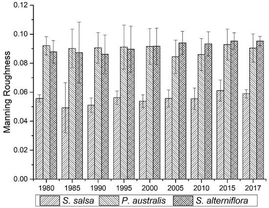 The Manning roughness coefficient is determined by vegetation type, vegetation coverage, micro-topography, soil matrix properties, and surface coverage [,]. There are three main types of vegetation in coastal wetlands: S. salsa, P. australis, and S. alterniflora. Those contributing to the Manning coefficient were fixed. The variance in the Manning roughness of S. alterniflora increased year by year, indicating that the variation in factors such as topography also increased year by year. This was consistent with previous research results.