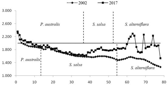 The Yancheng coastal wetland’s unique natural factors, such as climate, hydrodynamics, and geomorphic processes, enabled S. alterniflora to expand rapidly [,]. S. alterniflora is in a favorable position in interspecific competition because of its wide ecological range and sexual and asexual reproduction methods; it can grow in most areas of the coastal intertidal zone []. With its super expansion ability, S. alterniflora expanded, in 2000, into a strip landscape with a north–south connection and a width of several kilometers from east to west. S. alterniflora was introduced successfully, and the pioneer community on the ground gradually changed from S. salsa to S. alterniflora; the succession sequence of light beach → S. alterniflora appeared, which led to the disappearance of the succession sequence of light beach → S. salsa marsh, forming the succession sequence of S. salsa marsh → S. alterniflora marsh, which led to the disappearance of S. salsa marsh. Nowadays, S. alterniflora marsh is basically connected with reed marsh, and S. alterniflora has become the dominant community in the region. As a result, the plant community in the study area tends to be of a single type, resulting in a decline in habitat biodiversity; the number of suitable habitats continues to decline [], and the structure of bird communities will tend to simplify.