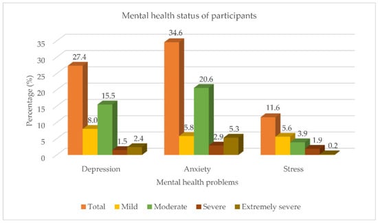 Table 2 describes the findings from the mental health status of the participants. Overall, 40.7% of participants had one or more symptoms of mental health problems of either depression, anxiety, or stress at different levels (mild, moderate, severe, or extremely severe). The majority of participants had moderate depression (15.5%), moderate anxiety (20.6%), and mild stress (5.6%), with mean Depression, Anxiety, Stress Scale-21 (DASS-21) scores of 15.61 ± 5.7, 13.89 ± 5.5, and 21.04 ± 5.3, respectively. Furthermore, Figure 1 portrays the mental health status of the participants in this study.