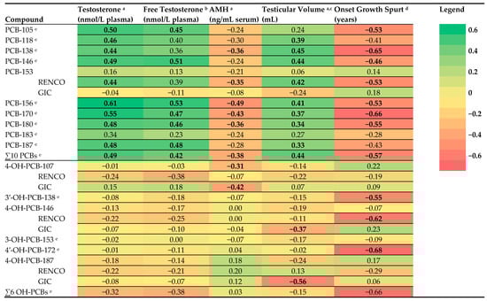 Heat map of adjusted beta coefficients obtained from linear regression analyses performed between log10 transformed prenatal levels of polychlorinated biphenyls (PCBs) and hydroxylated PCBs (OH-PCBs) and reproductive hormone levels and pubertal characteristics in boys. AMH: anti-müllerian hormone; associations with a p-value < 0.10 are shown in bold; a adjusted for age at examination; b adjusted for age and body mass index (BMI); c volume of the largest testicle and measured with an orchidometer; d adjusted for BMI and onset paternal growth spurt; only boys who reported ‘yes’ on the question whether they mentioned onset of growth spurt were included; RENCO cohort: Risk of Endocrine Contaminants on Human Health cohort; GIC cohort: Groningen-Infant-COMPARE (Comparison of Exposure-Effect Pathways to Improve the Assessment of Human Health Risks of Complex Environmental Mixtures of Organohalogens) cohort; e RENCO cohort.