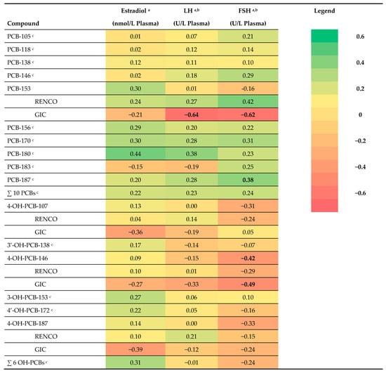 Heat map of adjusted beta coefficients obtained from linear regression analyses performed between log10 transformed prenatal PCB and OH-PCB levels and reproductive hormone levels in girls. LH: luteinizing hormone; FSH: follicle stimulating hormone; associations with a p-value < 0.10 are shown in bold; a adjusted for age at examination in months; b 1 sample < LOD, taken as LOD/2 in analyses; c RENCO cohort.