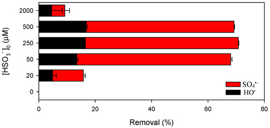 The increase of CBZ removal with increasing HSO3− dosage from 0 to 250 µM should be attributed to the increased formation rate of radicals. However, besides serving as the radical precursor, HSO3− also plays the role of radical scavenger. As shown in Figure S1, both HO• and SO4•− can be reduced by HSO3− with the second-order rate constants of 2.7 × 109 and 3.1 × 108 M−1 s−1, respectively. Consequently, the removal of CBZ decreased with further increase of HSO3− dosage from 250 to 2000 µM.