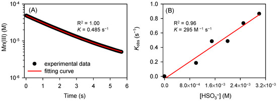 (A) Time course of Mn(III) (50 µM) reduction by HSO3− (2000 µM); (B) linear relationship between measured pseudo-first-order rate constants (kobs, s−1) and HSO3− concentrations. Conditions: [PP]0 = 2.5 mM, pH = 7.0.