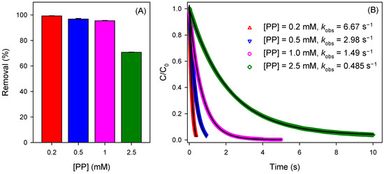 (A) Influence of the concentration of PP on CBZ degradation by the Mn(III)/HSO3− process at pH 7.0; conditions: [CBZ]0 = 5 µM, [Mn(III)]0 = 50 µM, [HSO3−]0 = 250 µM. (B) The reduction kinetic of Mn(III) by HSO3− in the presence of different concentrations of PP at pH 7.0; conditions: [Mn(III)]0 = 50 µM, [HSO3−]0 = 2 mM, the black line represents the fitting curve.
