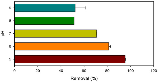 Removal of CBZ by the Mn(III)/HSO3− process under the pH range of 5.0–9.0. Conditions: [CBZ]0 = 5 µM, [NB]0 = 1 µM, [Mn(III)]0 = 50 µM, [PP]0 = 2.5 mM, [HSO3−]0 = 250 µM.