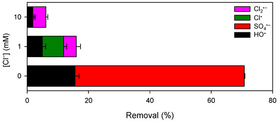 Previous studies have demonstrated that Cl−, one of the most common background water constituents, shifts the distribution of SO4•−-based AOPs due to the high reactivity of Cl− towards SO4•− [51,52]. Consequently, the treatment efficiency of SO4•−-based AOPs decreased with increasing the dosage of Cl−. Figure 7 shows the removal of CBZ by the Mn(III)/HSO3− process in the presence of different concentrations of Cl−. Consistent with previous studies [51,52,53], addition of 1 and 10 mM of Cl− retarded the degradation of CBZ, and the negative effect was more obvious with higher dosage of Cl−. Table S4 summarizes the principal reactions in the Cl−/SO4•− system along with their rate constants obtained from the literature. The conversion of radicals by Cl− complicates this process and results in the generation of multiple secondary radicals (e.g., HO•, Cl•, Cl2•−, and ClO•). It should be noted that ClO• was derived from the radicals (e.g., HO•, Cl•, and Cl2•−) with HOCl. The accumulation of HOCl was found to be negligible, which might be ascribed to the rapid consumption of HOCl by the added HSO3− (Figure S8). Thus, ClO• was neglected in this study. In addition, due to the fast consumption of SO4•− by Cl−, the concentration of SO4•− decreased significantly in the presence of Cl− at the level of mM and its contribution to pollutant abatement was commonly ignored [51]. Therefore, HO•, Cl•, and Cl2•− were considered to be the major reactive species responsible for pollutant degradation.