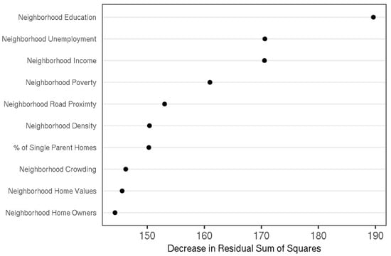 Ten most important features in predicting waist-to-height ratio z-scores. Dotplot showing the decrease in residual sum of squares when the decision trees include each of the most important features. Importance values are averages of the two prediction models. The most important features all characterize some aspect of the neighborhood.
