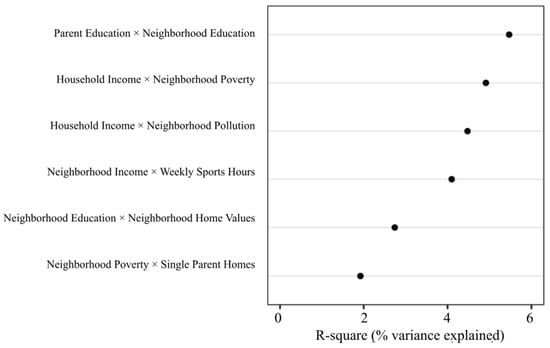 The two most potent interactions predictive of high waist-to-height ratios reported here are examples of so-called double-jeopardy effects in that they show compounding risks from different ecosystem levels []. Discovery of interactions between economic or educational resources in the household and community is consistent with evidence showing associations between these metrics and obesity. Evidence of interactions between interpersonal and community factors supports the idea that youth with the same household economic and educational resources can have different obesity risk levels depending on the economic and educational resources in their neighborhood []. Though the mechanisms are not clear, lower levels of education and economic resources could cause differences in food availability or consumption in the home and neighborhood that promote eating habits that cause obesity [,]. Future releases of the ABCD dataset that include features of the neighborhood food environment can make it possible to address these hypotheses.