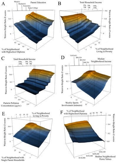 Feature interactions predicted waist-to-height ratio z-scores. 3d surface map showing waist-to-height ratio z-scores by quantiles of interacting features. The predicted waist-to-height ratio z-scores as a function of parent education level and % of neighborhood with a high school diploma (A), total household income and % of neighborhood living in poverty (B), total household income and particle pollution (C), median neighborhood income and weekly involvement in sports (D), % of single parent homes in neighborhood and % of neighborhood living in poverty (E), % of neighborhood with a high school diploma and median neighborhood home values (F). All surface maps are drawn using the first prediction model and holdout data to show the generalizability of each interaction.