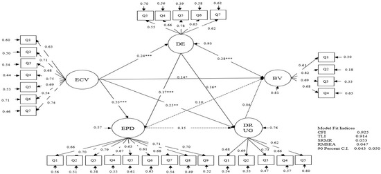 Estimates of the Pathways from Exposure to Community Violence to Bullying Victimization. Note. BV = bullying victimization, ECV = Exposure to community violence, EPD = Exposure to peer delinquency, DE = Depression, DRUG = Drug use. The asterisk mark is only displayed for the pathways between the study variables. The effects of the covariates on the variables were omitted in the figure. Please refer to the Measures section for indicators (Q1~Q9) of the latent variables. * p < 0.05; ** p < 0.01, *** p < 0.001.