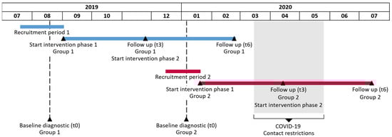 Results of this study showed a significant increase of self-reported physical exercise participation. Considering the WHO-GAPPA target of a 15% relative reduction in the prevalence of inadequate physical activity [3], this trial can be considered successful with 61% of participants at t3 and 38% of participants at t6 exercising according to or beyond physical activity recommendations. The decrease in physical exercise participation after the supervised period might have had several reasons: (1) The first group started with the second 12-week period in November. The months from October to March have been found to increase time spent sedentary on the northern hemisphere [50]. Poor weather conditions, as common in these months, have been stated as barriers to PA [22,51]; (2) The second intervention group had to be switched to online training already in the 9th week of the first intervention phase due to COVID-19-related contact restrictions. In addition, local sports clubs and also public sports facilities were not accessible for this group in the second phase.