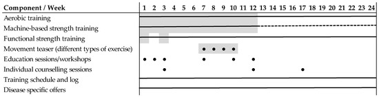 ‘MultiPill-Exercise’ relates to the biopsychosocial framework of the International Classification of Functioning, Disability and Health (ICF) [30]. It incorporates a biomedical perspective by dosing exercises according to the PA recommendations of the WHO, with the aim to improve body structures and functions. This in turn counteracts existing limitations in activities and participation and thus can ease the burden of the disease. To achieve physical activity-related health effects ‘MultiPill-Exercise’ includes an individualized training based on the individual’s physical capacity. For this purpose, the training prescription for endurance exercises is determined on basis of the cycling ergometry of the exercise pre-participation examination at the participant’s heart rate (HR) and power output (PO). For moderate exercises HR and PO at 110% of LT1 and for vigorous intensity exercises HR and PO at 90% maximum power output (Pmax) (for more details. Table A1) were used. Training intensity was monitored by individual heart rate responses or perceived exertion (BORG CR10 0–10 point [31]). Next to aerobic exercises 2–3 times/week for 30–60 min, machine-based strength training in the gym (1 x/week), functional strength training at home (1 x/week) were included in the intervention. However, this biomedical perspective cannot be effective until it is possible to encourage individuals to engage in regular health-promoting exercise and to support them in continuing to do so independently. The physical activity-related health competence (PAHCO) with its sub-domains—(1) ‘movement competence’; (2) ‘control competence’; and (3) ‘self-regulation’—is an important personal context factor enabling the individual to exercise in a health-enhancing manner [26,27]. ‘MultiPill-Exercise’ comprises specific elements to foster each of the subdomains. Therefore, educational sessions and workshops, individual counselling sessions and disease specific offers were included in the intervention. Motor abilities and skills as well as body awareness as relevant (1) ‘movement competences’ were supported in the exercise sessions. Four ‘movement teasers’ each lasting 60 min were included to make participants familiar with different types of exercises. Knowledge on training prescription and health effects of exercises, feedback on exercises and the integration of the gained knowledge in the home-based exercises were implemented to improve (2) control competence. When it comes to (3) self-regulation, motivational and volitional determinants are of particular importance. The intervention therefore put a specific focus on enabling participants to find individual motivation for exercising and suitable activities and to use techniques to ease behavior change. Weekly training schedules and logs served as further support (Figure 2). A more detailed description of the intervention concept has been described elsewhere [32,33].