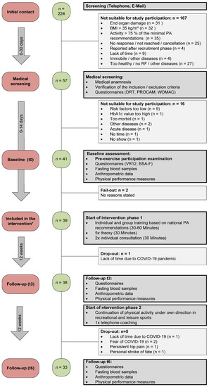 Overall n = 224 subjects were screened for eligibility, n = 57 participants were invited for medical screening of which n = 16 (28%) were excluded with reasons (Figure 3). N = 41 (72%) participants were eligible and underwent the exercise pre-participation screening and baseline examinations (no exclusions). Two persons withdrew their study participation consent before the start of the intervention. Finally, n = 39 (68%) participants were included in the study of which n = 6 were lost to follow-up (15% of included subjects).