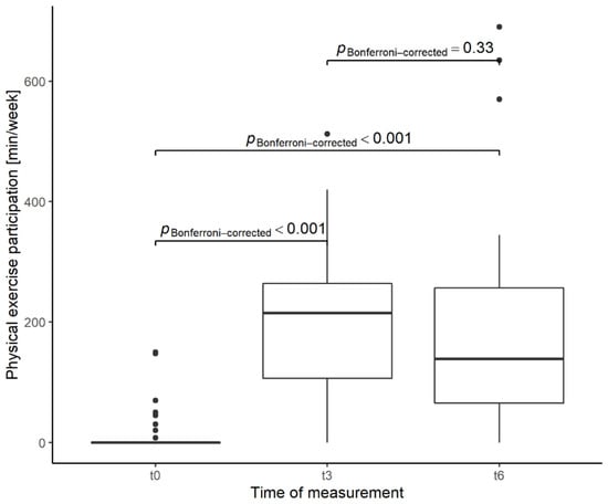 Figure 4 displays the median physical exercise participation distribution for all three time points as well as post-hoc differences. Sensitivity analyses without imputed data showed similar results (Supplement S2). The median level of reported physical exercise participation at baseline was 0.0 min/week and increased to 215 min/week at t3 and then declined again to 139 min/week at t6. Overall, 24 (61%) participants exercised in line or beyond the PA recommendations at t3. At t6, 15 (38%) participants reported a physical exercise participation in line with the PA recommendations. Seven participants (18%) reported not to perform any physical exercise after 6-month, while the remaining participants stated an increase in physical exercise participation compared to baseline. Individual changes in physical exercise participation are displayed in Figure A1.