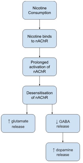 Nicotine has been identified as the main addictive constituent within tobacco due to its rewarding effects within the brain that drive individuals to repeatedly smoke. Associative learning plays a major role in the formation of nicotine addiction. Individuals may associate the lighting of a cigarette, for example, with the cognitive and emotional benefits they will feel from smoking. These may include a greater sense of well-being, feeling more relaxed, and reduced anxiety as well as feeling more alert and focused [,]. Individuals may seek to feel these effects again with continued nicotine use, suffering withdrawal symptoms if usage is halted. Human studies have reported cognitive-enhancing effects, such as improvement of fine motor functions, attention, working memory, and episodic memory, in long-term use of nicotine after withdrawal alleviation. These positive reinforcing effects may further encourage the maintenance and continuation of nicotine use due to unpleasant side effects if cessation occurs. Cognitive side effects may include difficulty concentrating, impaired attention, and impaired working memory [,].