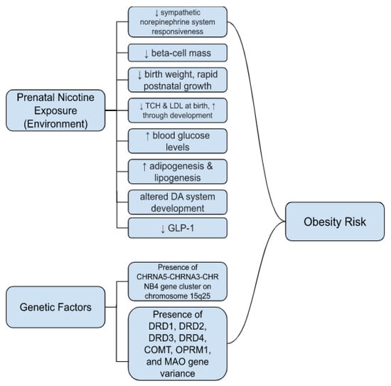 Daily usage of nicotine has been seen to have numerous negative side effects that influence cognitive and behavioral functioning. In a study looking at middle-aged, primarily Caucasian males undergoing chronic nicotine exposure via cigarette smoking, results showed that fine motor dexterity, general intelligence, and visuospatial learning and memory were recorded to be of inferior performance compared to a control group of nonsmokers []. These detrimental effects of nicotine are not limited to adults. A major concern is that women continue to use nicotine products throughout pregnancy, which can have long-term impacts on their child. Maternal smoking during pregnancy is associated with numerous adverse effects including pregnancy complications and fetal development. Prenatal nicotine exposure has not only been indicated to increase risk for complications at birth, but it has also been estimated that exposure to tobacco smoke leads to reduced fetal growth, increased risk for cleft lip/palate, auditory issues, and behavioral problems such as conduct disorder and ADHD seen later in adolescence [,,,,,,,,,]. Prenatally exposed offspring also have a higher risk for altered brain structure and function related to nicotine’s effects on neurotransmitter systems during development, a possible explanation for these behavioral issues. Adverse effects may continue throughout growth, including later-in-life metabolic dysfunctions, such as obesity [,,]. The current review aims to investigate the effects of prenatal nicotine exposure on obesity risks and the possible mechanisms behind this association.