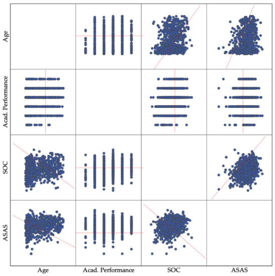 Figure 1 shows the graphical (bivariate) trends among age, academic performance, the ASAS, and the SOC scores, depicting the potential existence of consistent bivariate trends between pairs of variables, to be corroborated through Pearson’s r tests in the subsequent paragraph.