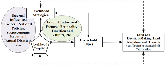 Apart from the influence of livelihood capital on hindering or driving livelihood changes [19], it is also affected by external and internal factors [41]. Livelihood capital and livelihood strategies can be significantly affected by external factors, such as national policies, intractable socioeconomic issues, and unexpected natural disasters [42]. For example, the Household Contracted Responsibility System (HCRS), which was implemented in 1978, contributed to improvements in the possession and allocation of disposable livelihood capital, especially for essential household natural assets such as contracted land, but also prompted the surplus agricultural labor force to enter non-agricultural industries [43], which reversed the straitened circumstances of the vulnerable and single livelihoods of rural households [44]. After entering the 21st century, rural households were significantly affected by local and global urbanization and industrialization [45,46]. The increase in non-farming income resulted in a lot of young people leaving the countryside and abandoning farming (such as abandoning or transferring-out land). Therefore, the livelihood capital, livelihood strategies, and relationships with the land of this new generation changed significantly. Consequently, the livelihood capital and livelihood strategies of the household types became more differentiated as households adopted different land use decisions to adapt to their special situations.