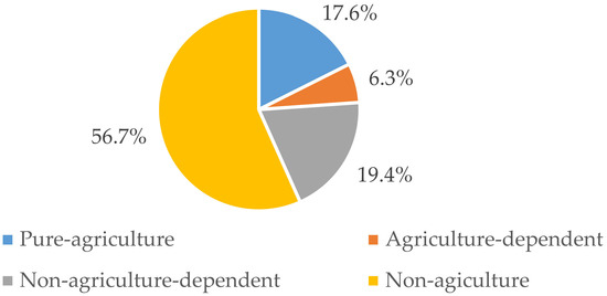 The household livelihood strategies were divided into four types based on the ratio of household non-agricultural income to total income. As shown in Figure 3, non-farming and non-agriculture-dependent livelihood activities were common. The percentage of rural households engaging in non-agricultural livelihood strategies was as high as 56.7%, and the percentage that was non-agriculture-dependent was 19.4%, which suggested that there was a significant number of households participating in non-farming employment. Contrarily, there were significantly fewer households with agriculture-dependent livelihood strategies at around 6.3%.
