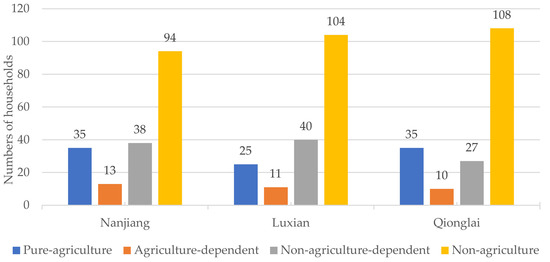Figure 4 shows that the ratio of livelihood strategies in the different study areas was generally non-agriculture > non-agriculture-dependent > pure-agriculture > agriculture-dependent. The number of households in Qionglai with pure-agriculture livelihood strategies was second only to non-agricultural livelihood strategies and non-agriculture-dependent livelihood strategies, which was inconsistent with other regions and indicated that Qionglai households may be more positive about agricultural production and operations than those in Luxian and Nanjiang.