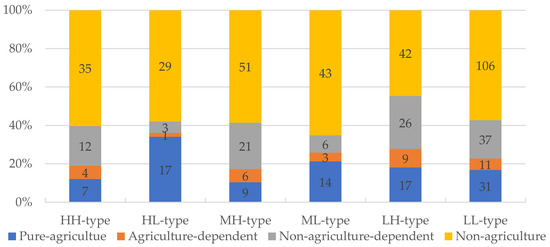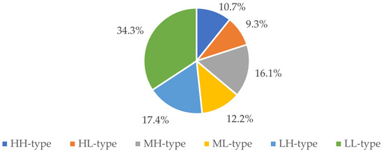 All six rural household ratio types are shown in Figure 5. The highest percentage was found to be the LL-type rural households at 34.3%. There were somewhat fewer LH-type and ML-type rural households at 17.4% and 16.1%, and even fewer HH-type and ML-type rural households at 10.7% and 12.2%. The percentage of HL-type rural households was the lowest at 9.3%. These results revealed that there was an overall livelihood capital deficiency and low-level livelihood diversity in the survey area.