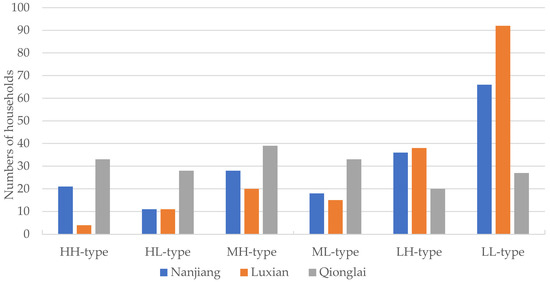 By analyzing the household type distributions in the different study areas (Figure 6), it was found that the household type orders in Nanjiang and Luxian were: households with low livelihood capital (102 and 130) > households with medium livelihood capital (46 and 35) > households with high livelihood capital (32 and 15). The different household type distributions had large deviations, with most LL-type households having low-level livelihood capital and livelihood diversity indices. However, in Qionglai, the household type order was: households with medium livelihood capital (72) > households with high livelihood capital (61) > households with low livelihood capital (47). Therefore, the household type distributions were relatively well-proportioned in comparison to Luxian and Nanjiang.