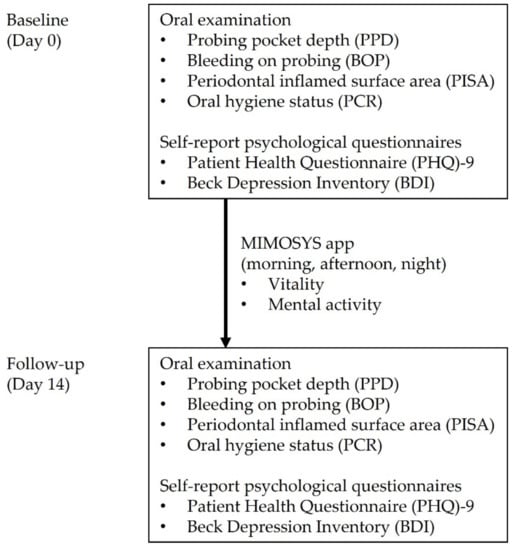 Forty students of Okayama University participated in this study. Inclusion criteria were that participants must be over 20 years of age. Exclusion criteria were as follows: (1) participants with a medical history of systemic disease; (2) participants who had not received periodontal treatment within 3 months; (3) participants with a medical history of taking antibacterial, anti-inflammatory, or anti-allergic drugs within the past 2 weeks; and (4) participants with a history of smoking [27]. Each participant underwent the oral examination and self-reported questionnaire on the first day (baseline) and the 14th day (follow-up). Voice recording was performed every day with the MIMOSYS app during the whole study period.