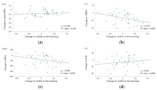 Figure 2. Correlation between change in vitality in the morning and (a) change in mean PPD; (b) change in %BOP; (c) change in PISA; and (d) change in PCR.