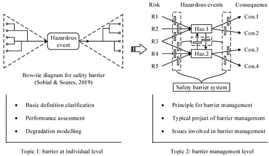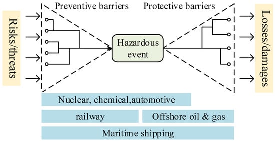 The safety barrier system, as illustrated in Figure 14, can usually be broken down into barrier elements that prospectively function to intercept the possibility of risks or threats before and after the identified hazardous events. Conceptually, safety barriers are closely related to layers of defenses, which are widely thought of in terms of the “Swiss Cheese” model [100]. With the initiation of barrier element identification, the potential hazardous events involved in the system need to be identified. For this purpose, typical quantitative risk assessment (QRA) is frequently considered in the development of comprehensive methodologies. The baseline risk assessment tool (BART) is a practical example comprising simplified QRA-related approaches to identify the potential hazardous events arising from the process of oil and gas installations [101]. In addition, vulnerability models designed for infrastructures or equipment are frequently integrated into QRA procedures to determine hazardous events after natural disasters, such as earthquakes [102], floods [103] and lightning strikes [104]. More recently, traditional QRA approaches have been mapped into advanced risk assessment techniques, such as Bayesian networks [105,106], artificial neural networks [107] and directed complex networks [108], to identify and evaluate hazardous events leading to the occurrence of accidents. Based on the identified hazardous events, the barrier elements are mainly determined by means of qualitative approaches, and many graphical techniques are reported to illustrate the identification process of safety barriers, such as event tree analysis [109], safety barrier diagrams [34] and Bow-tie diagrams [77]. These techniques are compared by Sklet [110], who finds that the Bow-tie diagram is the most commonly used graphical technique. In a typical graphical representation of the Bow-tie, the central event is described using several terms, such as top event [111,112], critical event [37], intermediate event [34] and hazardous event [16,75], and in this paper, the term hazardous event is used thereinafter. The left part of hazardous events can be analyzed by fault tree analysis (FTA), while the right part can be coped with event tree analysis (ETA) [113], by which barrier elements are identified for different application scenarios [37,63,74,75].