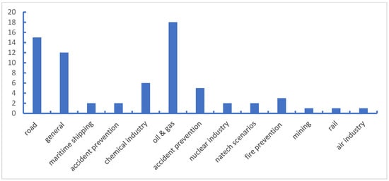 To obtain the general distribution of safety barrier research, all the filtered documents are browsed and assigned to suitable application scenarios that are determined by the studied objects. The results are shown in Figure 3. The scientific contributions associated with safety barriers are largely in the field of offshore oil and gas and transportation (including roads, shipping, air and rail), where published papers account for approximately 62% of the total scientific production. To clarify the distinctions between categories with potential overlaps, classification principles may be proposed as follows: (1) the studies associated with the prevention of various accidents, including road injuries, marine disasters and firefighting, are classified into accident prevention, such as the research work by Bellamy et al. [32] and Lenoble et al. [33]; (2) the papers that focus on the principle and assessment of safety barriers are categorized as general, in which review articles are also included; (3) the papers on issues that appeared in oil and gas processing in land-based facilities are attributed to the category of the chemical industry, while the production of oil and gas at sea is considered in the offshore oil and gas group; for instance, the study associated with hydrogen application implemented by Duijm and Markert [34] is grouped as the chemical industry.