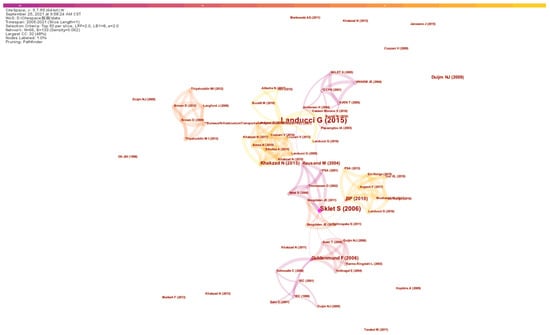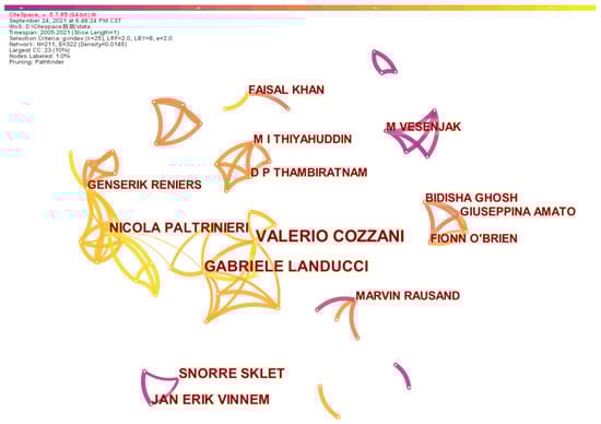 The most globally cited paper is “Safety barriers: Definition, classification, and performance”, which is a review conducted by Sklet [9] with 190 citations (11.88 per year on average). Notably, Dianous and Fievez [37] systematically explained the principle of the ARAMIS project, with their work cited 126 times in the analyzed period, the second most cited paper. In addition, the paper titled “Barrier and operational risk analysis of hydrocarbon releases (BORA-Release) Part I. Method description” [38] is also frequently cited by scholars due to its good explanation of the principle of safety barriers defending against operational risks. According to the mapping of citations illustrated in Figure 7, Snorre Sklet and Gabriele Landucci are the two most cited scholars in the citation network. The contribution of Snorre Sklet from NTNU is largely due to his review article titled Safety barriers: Definition, classification, and performance, which is regarded as the most cited paper, and active collaborations with scholars in Northern Europe can be observed, such as with Aven Terje from the University of Stavanger and Nijs Jan Duijm from the Technical University of Demark, all of whom are known due to their contribution to the field of risk analysis and reliability. Therefore, the scientific contribution made by these scholars in Northern Europe can be regarded as an obvious cluster within the network. Another cluster is developed with the papers associated with Landucci [18], and Gabriele Landucci (affiliated with Università di Pisa, Italy), who are also ranked among the most productive scholars.