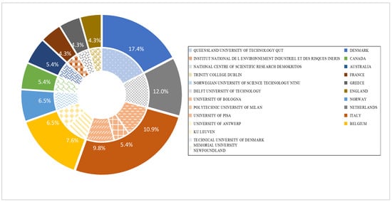 In most cases, the academic contribution of authors is closely related to the countries and institutions to which they affiliate. The abovementioned 328 authors belong to 159 institutions in 39 different countries. In the present study, institutions with more than four papers are selected as the analysis sample, which contains 13 institutions and 10 countries with 92 papers accounting for 81.4% of the total publications. The distribution of academic production by institutions and countries is illustrated in Figure 5. It should be noted that China is absent from the productive countries presented in Figure 5 even though China is ranked as the fourth most productive country, with 12 papers published. The reason for this is that there is no institution or scholars in China regarded as productive in the field of safety barriers. A similar situation applies to the case of Brazil. It is interesting to find that all the academic production of Norway (the second most productive country) is mainly attributed to NTNU, which is regarded as the most productive institution globally, with 16 publications. The situation for the Netherlands is more interesting in that all the academic contributions associated with safety barriers are made by the Delft University of Technology, which is famous for advanced engineering technology. In addition, Italy is observed as being the most productive country where the publications mainly come from the University of Bologna, the University of Pisa, and Polytechnic University of Milan. According to the statistics illustrated in Figure 5, all the institutions, with the exception of Memorial University Newfoundland (Canada) and Queensland University of Technology (Australia) in the analysis sample, are scattered across Europe, accounting for 89.1% of the publications contained in the sample.