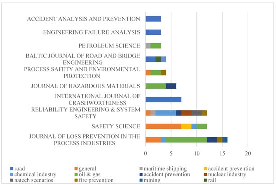 According to Figure 8, the most relevant source is dominated by the Journal of Loss Prevention in the Process Industries with 16 publications, which is followed by the journals Reliability Engineering and System Safety and Safety Science with 12 papers. The total number of papers published in the aforementioned three journals accounts for approximately 39% of all papers in the database sample. In addition to the journals listed in Figure 9, there are still 30 other journals with only one article published. Even though Reliability and System Safety is not ranked first, it is regarded as the most comprehensive journal, involving seven different fields, with only the field of offshore oil and gas missing. However, approximately 45% of all papers on issues in the field of offshore oil and gas are published in the Journal of Loss Prevention in the Process Industries, in which there are no articles in the fields of maritime shipping and accident prevention. In addition, the articles published in Safety Science are mainly focused on the topics of review, assessment and the leading descriptions of safety barriers, which are attributed to the general group. Furthermore, it is interesting to observe that there are journals that only publish scientific research from industrial fields; for instance, all the papers published in the International Journal of Crashworthiness, Engineering Failure Analysis, and Accident Analysis and Prevention are associated with road transportation. The articles’ sources can be further analyzed by mapping the network with regard to their co-citations, in which the relation between two different publications can be evaluated according to the number of documents citing both of these papers [44]. As a result, the mutual relationships between paper sources are visualized in Figure 9. A total of 30 sources are selected in this study according to the citation ranking for the different sources, and the weights are represented by the value of citations.