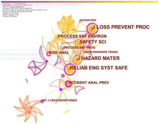 The papers contained in the developed database in this study are attributed to 47 different journals and published in the 16-year period from 2005 to 2021. As one of the important elements of bibliometric analysis, the sources of the papers involved in the database sample are analyzed; the top 10 journals with more than three articles are presented in Figure 8. These top journals are widely regarded as being of high quality in the field of risk analysis and safety, including the Journal of Loss Prevention in the Process Industries, Safety Science, Reliability Engineering and System Safety, and Accident Analysis and Prevention. Meanwhile, the network of paper sources based on citations is mapped, as shown in Figure 9.