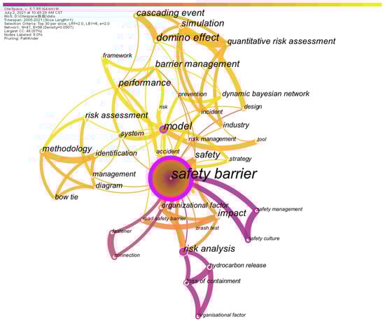According to the contents involved in Figure 10, the majority of terms in this study are associated with issues of safety and risk. As mentioned in Section 2.1, “safety barrier” and “barrier management” are selected as the keywords to search the WoS; however, the frequency of “barrier management” is much lower than that of “safety barrier”. It is interesting to discover that the appearance of “accidents” in this network is not noticeable, which indicates that safety barrier studies have emphatically improved the system in terms of safety and reliability with the recognition that accidents are undesired conditions of the system. Based on the location of “accident” in the network illustrated in Figure 10, the function of “accident” can be considered to verify or analyze the performance of safety barriers because of its connection between “safety barrier” and “performance”. In addition, the keyword “model” is critical for the topological characterization of the network illustrated in Figure 10, and the modeling of “safety barriers” can be applied to develop barrier management systems, evaluate barrier performance, and establish safety strategies. The terms domino effect, cascading events and quantitative risk assessment indicate the recent application of safety barriers to interrupt risk propagation in domino events, and the presence of Bow-ties and diagrams implies that the study of safety barriers is frequently mapped into the Bow-tie diagram to identify the functions of safety barriers and implement risk assessment and analysis. In Figure 11, the keywords are generally clustered into 4 stages based on time. Based on the keywords that appeared in the first stage from 2005 to approximately 2008, it can be inferred that the concentration of barrier studies is focused on the chemical industry, such as hydrocarbon release. Then, with the development of a general theory for safety barriers, the concept of barrier management proposed in 2015 signified the second period of safety barrier research during which organizational factors known as nontechnical factors are fully considered for risk management. Regarding the third stage, in 2018, research on safety barriers became extensive, and various models were developed to cope with the performance assessment and risk analysis in different scenarios, such as domino events [45], offshore oil and gas [46], and the chemical industry [47]; however, advanced techniques aimed at addressing safety barriers are still undeveloped even though some methodologies involving Bow-tie diagrams and probabilistic-based methods have been explored to implement quantitative risk assessments, such as [10,48,49]. In the most recent stage, starting in 2020, the dynamic Bayesian approach is applied to the issues of safety barriers, which can be considered the beginning of advanced technologies being applied in the field of safety barriers. In the near future, it can be reasonably inferred that there will be an increasing number of advanced technologies utilized to quantitatively analyze the issues associated with safety barriers.