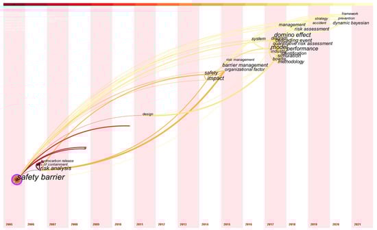 The keywords, including the author’s keywords and keywords plus, are statistically used to illustrate the frequency of words used by scholars. Based on the number of mutual occurrences in the articles contained in the database, the co-occurrences of these keywords are mapped in Figure 10, in which the width of connection indicates the number of mutual co-occurrences, and the frequency of a single keyword appearing in the database is represented by the radius of the circle. In addition, the color of the connections is used to imply the time when the mutual co-occurrences of the two keywords occurred. To better understand the research tendency of safety barriers from the perspective of keywords, the time is set up as the analysis axis, and the results of reorganizing the keywords are presented in Figure 11.
