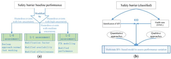 Based on the framework illustrated in Figure 13a, this methodology is proposed under the assumption that the performance degradation of safety barriers is mainly caused by the occurrence of hazardous events. The baseline performance of safety barriers is initially assessed by means of the tailored LOPA approach with consideration of factors associated with available technical information, such as maintenance, operational conditions and running data [80], and then, a three-level methodology is proposed on the basis of the uncertainty associated with hazardous events. In the case of low uncertainty of hazardous events, the values for the availability and PFD are regarded as Boolean varieties, namely, they are valued as 0 or 1. A level-one assessment was implemented with increasing uncertainty. A performance modification factor was introduced to modify the values of availability and effectiveness, and this factor can be determined through expert elicitation on the basis of available information on site [76]. If the uncertainty increases further, the L-2 assessment would be applied to identify the modified performance of the safety barrier by means of FTA. Different from the three-level methodology proposed by Misuri et al. [21], Dimaio et al. [74] did not emphasize the calculation of the baseline performance of the safety barrier, as shown in Figure 13b, they paid more attention to the barrier performance variation caused by the varying conditions. The foundation for the study of Dimaio et al. [74] is the assumption that the health state (HS) can be utilized to represent the safety barrier performance in the aspects of judging whether the designed barrier function is fulfilled or not. The barrier HS may be discretized at different levels, such as high, medium, and low. In this way, the safety barrier performance can be regarded as being valued by discretized variables, which are defined between the Boolean variables and continuous variables (the value of performance modification factors) proposed in Misuri et al. [21]. According to [74], the safety barrier HS can be determined on the basis of updated KID in the aspects of key performance indicators (KPI) by quantitative or qualitative approaches. Finally, the safety barriers are mapped into a multistate Bayesian network based on whether the performance variation of the safety barrier can be reflected by means of the variable value of HS.