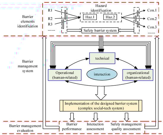 From the engineering perspective, in most cases, the safety of a system or infrastructure is successfully maintained with the comprehensive application of various barriers, as discussed by Kjellen [98]. The design and implementation of safety barriers are considered at the system level, and safety barriers can usually be hardware, software, operational or organizational, which interact with each other [31,73]. As a result, the concept of barrier management systems can be developed. According to the definition by PSA [62], barrier management refers to “coordinated activities to establish and maintain barriers so that they maintain their function at all times”. Later, PSA [99] suggested that the industry should acquire a better understanding of operational, organizational and technical safety barriers and their interactions. Therefore, in the present study, as illustrated in Figure 14, the safety barrier management system is described and reviewed from the following three aspects: barrier element identification, barrier management system and barrier management evaluation.