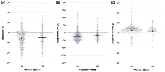 Relative change of vital signs during music therapy sessions in 40 stable preterm infants receiving music therapy with (159 sessions) and without (444 sessions) physical contact at the University Hospital Essen between October 2018 and July 2021. A negative value indicates a lower, and a positive value a higher, post-therapy value compared to the baseline value. + signs = individual measurements; blue line = median; red diamond = mean. (A) Heart rate. (B) Respiratory rate. (C) Oxygen saturation.