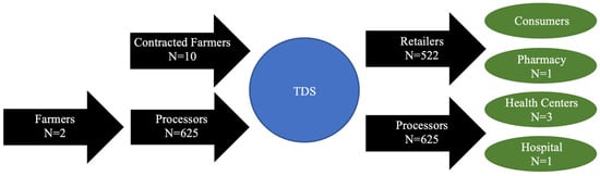 The instant fortified flour value chain is composed of several key stakeholders, including small and medium-scale farmers, processors/retailers, and medical personnel, as illustrated in Figure 1. Figure 1 shows the participants’ locations in the instant fortified flour value chain, moving left to right from production to consumption. The far left represents the production phase of the value chain. Then, the processing phase of the value chain included: contracted farmers (contracted for the women retailers network) delivering raw ingredients to TDS and women processors bringing raw ingredients (that they purchase from farmers) to TDS, which receive the extrusion technology and fortification techniques from the project. Next, women retailers and processors sell the instant fortified flours to consumers and some medical personnel, who distribute the flours to under or malnourished patients. To interview these key stakeholders along the value chain, in January 2020, we visited: TDS’s processing facility; a point of sale for the flours; and medical facilities. We documented the impact of the project by surveying/interviewing women’s groups (i.e., leaders and randomly selected members from the groups) who are processors and retailers of the flours, farmers (who sell millet to TDS), and medical personnel who represented the health centers and a pharmacy and hospital that use and/or sell the flours. We also interviewed a private medical center that was interested in selling the flour to patients and interviewed another woman leader, Mme Bousso, who distributes much of the flour. In addition, we made observations and held participatory focus group research activities with 112 randomly selected women retailing and processing entrepreneurs to understand the impact their involvement has had on their empowerment, incomes, and households, as well as ways to improve the project moving forward.