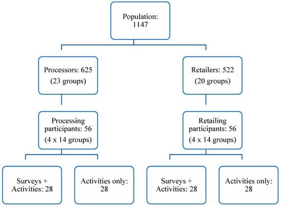 We separately surveyed all 23 processing and 20 retailing group leaders and asked them to notify their members that we may be calling them in a few days. Then, we obtained lists of names and phone numbers (from each group leader) of all the women involved with the instant fortified flours. If a member did not have a phone, we obtained details on how to reach them through either another member, or as a last resort, the group leader. Then, we randomly selected 14 groups of processors and 14 groups of retailers. From these groups, we randomly selected four women for the participatory research activities, which are discussed in the subsequent section. If a participant did not pick up the phone, we waited 5 min, and if they did not call back, we contacted the next participant on the randomly ordered list. Of the four women selected from each group, we randomly selected two of those members to be surveyed prior to participating in the activities. These individuals were told to arrive earlier in the morning than those who were only participants in the activities. In total, we had a sample size of 112 women from 14 processing groups and 14 retailing groups for the participatory activities, 56 of whom were to be surveyed.