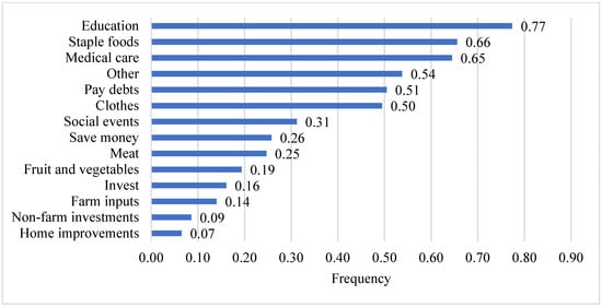 Ninety-eight percent (98%) of the women surveyed reported their household income increased due to their involvement in the program. Figure 6 shows how they spent this increased income. Most notably, 77% reported increased spending on education for their children or themselves. Others increased their spending on staple foods (66%), medical care (65%), and paying off debts (51%). Nineteen percent (19%) reported spending more on fruits and vegetables, and 25% reported spending more on meat, increasing their dietary diversity.