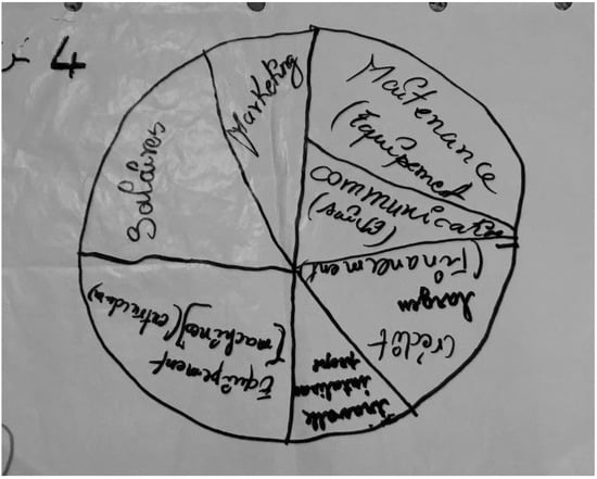 Figure 10 shows an example from a pie chart activity with one of the women retailer groups. For this activity, the focus groups ranked the importance of their responses to this question: “What’s most important to be a successful retailer/processor?” Overall, the focus groups typically ranked the following as the most important for their success: marketing, gaining experience, equipment, good salaries, solidarity box (social fund), having qualified staff, partnerships with farmers, access to storage facilities, and the freedom to work (as women). For their second list of importance, the groups listed maintenance, accountant, financing/financial advice, car (for transportation), customers, and respect for each other. A few groups ranked some of these lower than the most important or of secondary importance. The third ranking of importance included: access to credit (financing for selling), NGO/government/private partnerships, electricity, and water. Finally, the women listed the following as fourth in importance for their success: visibility of their business in the community, saving money, having an employer with a high level of experience, legal advice, and worker safety.