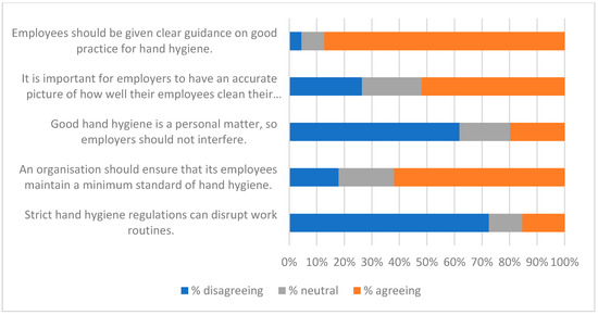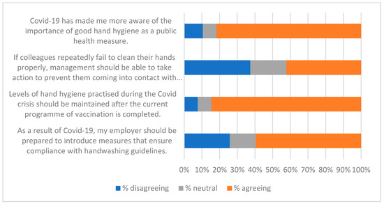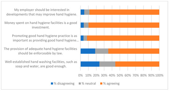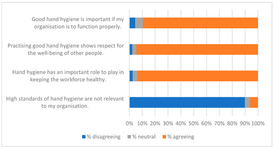 Figure 1, Figure 2, Figure 3 and Figure 4 suggest general acceptance of the importance of hand hygiene. For most of the statements, over 80% of respondents shared similar views, agreeing with positive statements, and disagreeing with the negative assertion that high standards of hand hygiene were not relevant to their organisation (Figure 1). Areas where there was less consensus can be accounted for by some of the themes identified in the interviews and in response to the questions in Appendix B (summarised in Table 8). Most prominent amongst these are