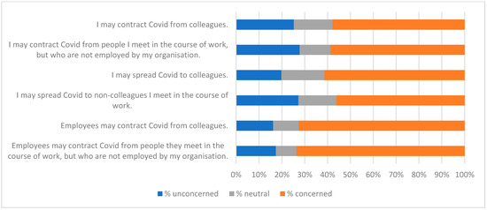 Figure 5 was interesting because it indicated that levels of concern about transmission in the workplace were higher when managers were expressing views about the workforce than when the workforce was expressing views about itself. The last two statements in Figure 5 were targeted specifically at managers. As discussed below, the managerial level was not significantly related to responses to any statements, and so was presumably not a factor in responses to the first four statements.
